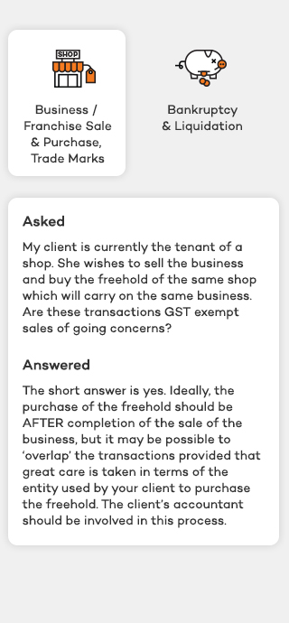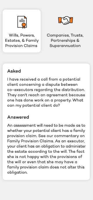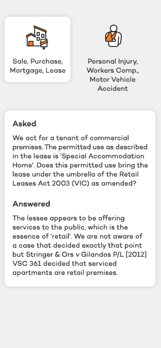 Subscribers are entitled to ask Mentor any reasonable question on any area of Australian law in relation to which By Lawyers publishes guides and precedents, except for Western Australia, Tasmania, ACT and Northern Territory. Questions may only be general in nature and must not identify any actual client matter.